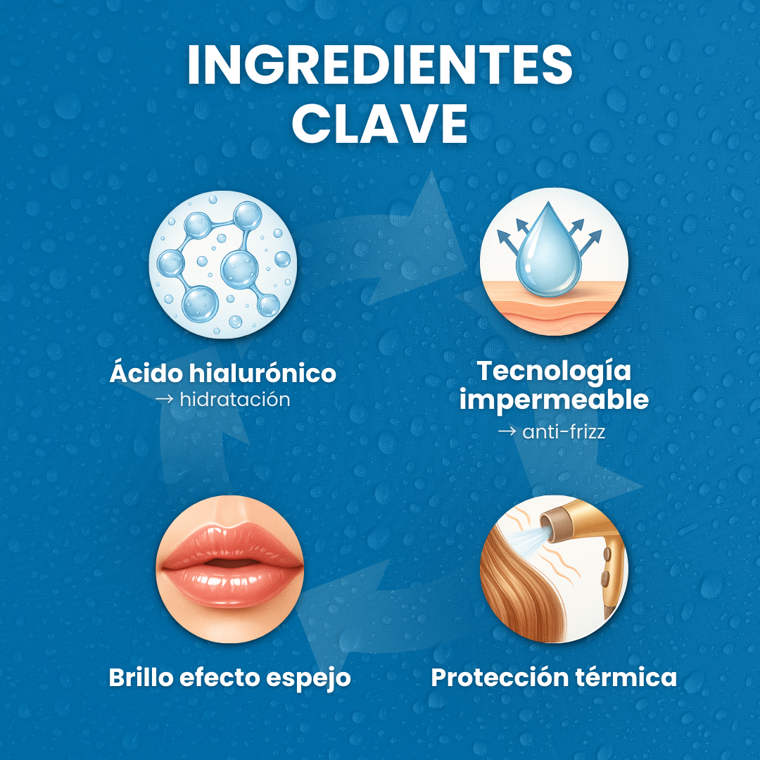 El ácido hialurónico hidrata profundamente cada fibra capilar, mientras que la tecnología impermeable crea una barrera invisible que repele la humedad externa hasta por 3 lavados. El complejo de brillo efecto espejo alisa las cutículas para reflejar la luz naturalmente, y la protección térmica avanzada resiste hasta 220°C permitiéndote usar herramientas de calor sin daño.