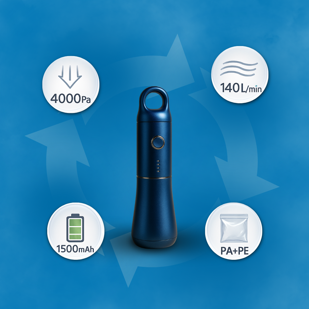 La bomba de compresión Sovana AirTravel optimiza tu espacio en segundos. Con su potente succión automática, reduce el volumen de tu ropa hasta en un 80%, permitiéndote viajar con más ligereza y orden.