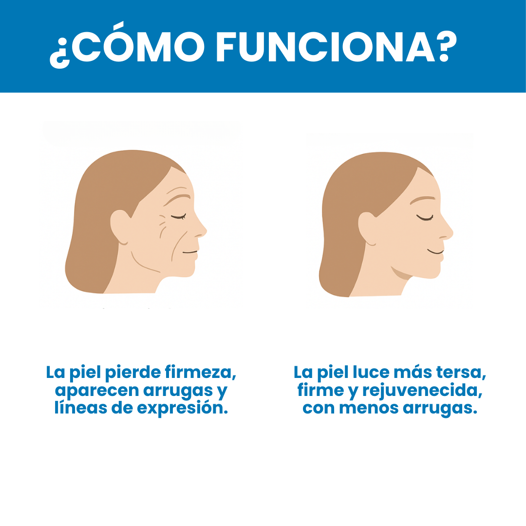 ¿El secreto? Nuestra fórmula exclusiva combina péptidos tensores de acción rápida, extracto de algas marinas y ácido hialurónico de bajo peso molecular que penetra instantáneamente en la piel.